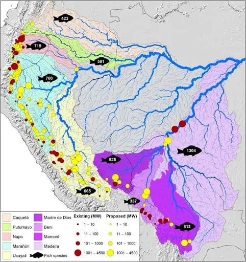 Dams and fish in the Amazon River Basin (Anderson et al., 2018). Red circles show existing dams. Yellow circles show proposed future dams. Different colors represent smaller watersheds within the greater Amazon River watershed. The fish symbols show the number of fish species counted in each smaller watershed.